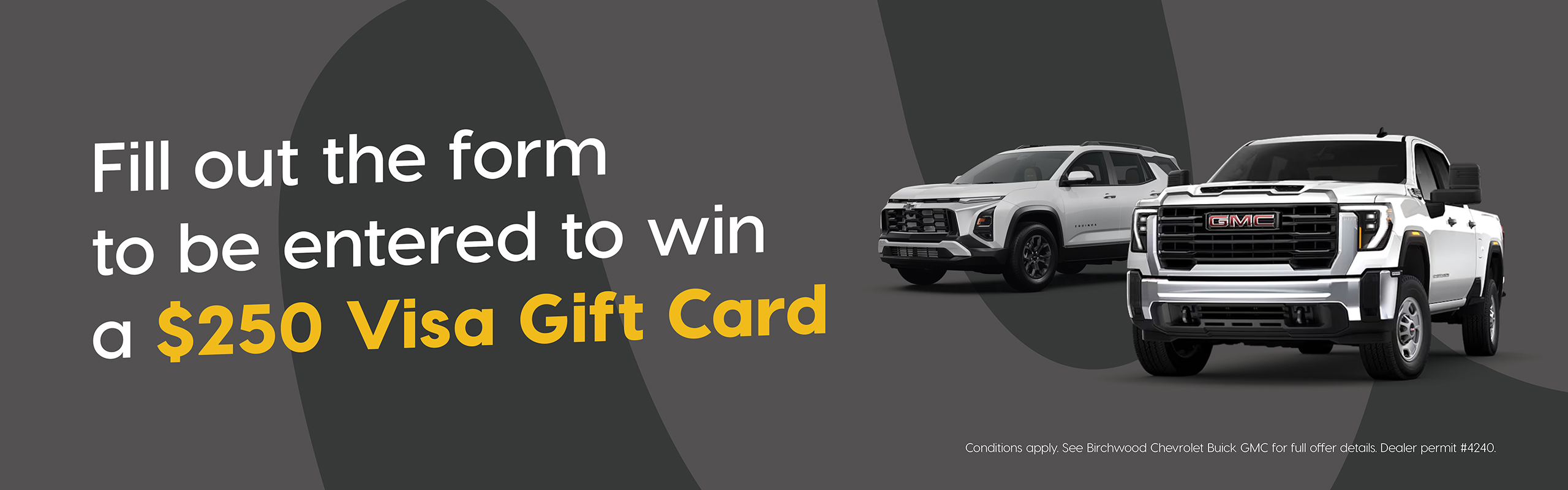1. Eligibility: “Birchwood’ Chevrolet $250 Visa Card” Contest is open only to those who sign up via the landing page, conditions apply. The contest is only open to legal residents of Canada and is void where prohibited by law. Employees of Birchwood Automotive Group (the “Sponsor”), their respective affiliates, subsidiaries, advertising and promotion agencies, suppliers and their immediate family members and/or those living in the same household of each are not eligible to participate in the contest. The contest is subject to all applicable federal, provincial and local laws and regulations. Void where prohibited.
